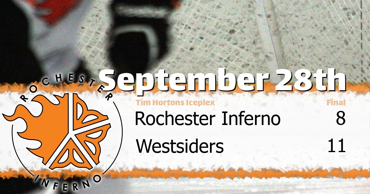 TIM HORTONS ICEPLEX, September 28, 2025 - The visiting Rochester Inferno Sunday (Morgan) took on the Westsiders in a matchup on Sunday. The Westsiders defeated the Inferno 11 to 8 at Tim Hortons Iceplex. This was the first match-up between these two teams.