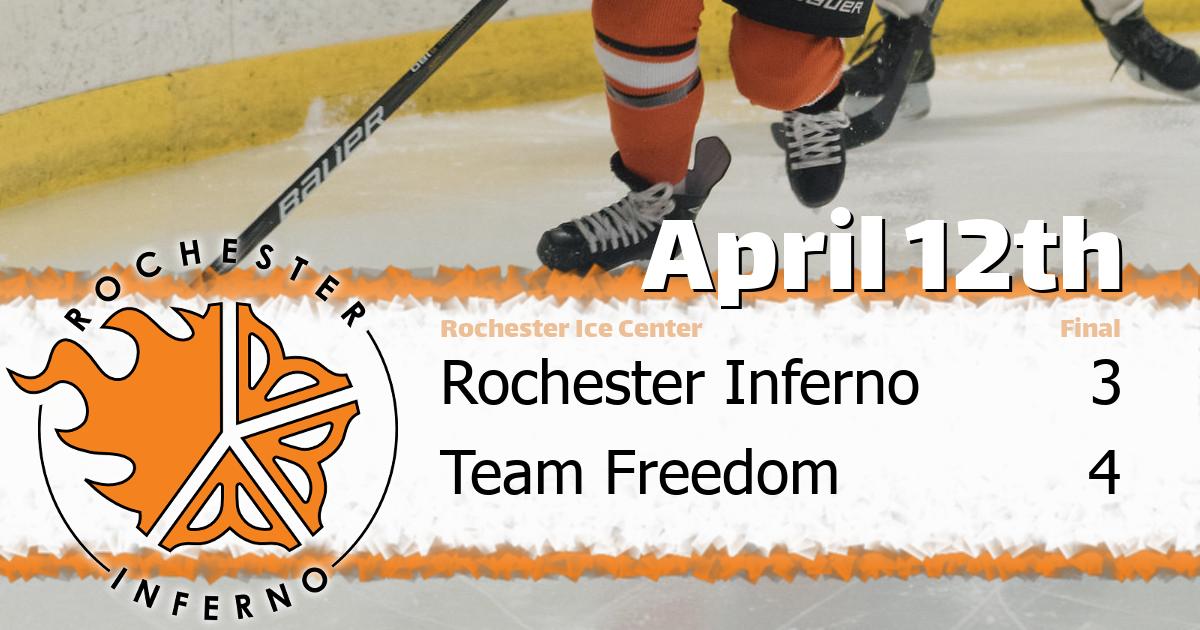 ROCHESTER ICE CENTER, April 12, 2026 - The visiting Rochester Inferno Sunday (Morgan) took on the Team Freedom in a Spring Classic 2026 matchup on Sunday. The Freedom defeated the Inferno 4 to 3 at Rochester Ice Center. This was the 2nd match-up between these two teams, and their last matchup was won by the Team Freedom 7-1. The Team Freedom leads the series 2-0-0.